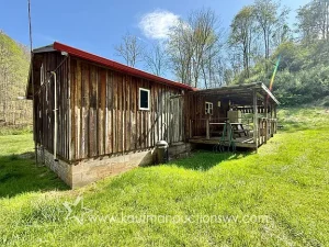 The land surrounding the cabin is a mix of open and wooded areas, providing both usability and natural beauty. Road frontage ensures accessibility, while a stream running through the property adds to its appeal and functionality.