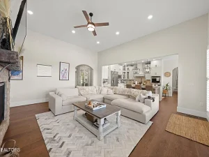 The main living areas follow an open-concept design, creating a warm and inviting atmosphere ideal for both daily living and entertaining. The kitchen overlooks the main living space, allowing for effortless interaction and flow. A large fireplace anchors the living area, adding warmth and character while serving as a focal point for gatherings.