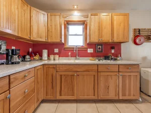 The kitchen serves as the heart of the home, featuring beautiful hickory cabinets that provide both aesthetic appeal and practical storage. Hickory’s natural grain patterns add warmth and texture, enhancing the cozy mountain atmosphere. Whether you are preparing a hearty breakfast before tending livestock or hosting a family dinner, this kitchen offers efficiency and charm in equal measure.