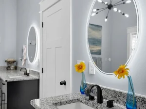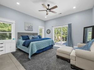 The luxurious primary suite serves as a private retreat within the home. Featuring dual six-foot vanities, the space provides ample room for daily routines without crowding. A large soaking tub creates a spa-like atmosphere, perfect for unwinding after a day spent exploring the land or entertaining guests. Custom closets throughout the home offer organized storage solutions, while an oversized mudroom enhances functionality—especially valuable for a property centered around outdoor recreation.