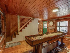 Adding to the fun is a full-size shuffleboard table, making the room not only a cozy retreat but an entertainment hub. Whether for family game nights or evenings with friends, this space brings people together.