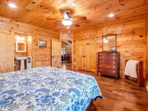 This true log cabin features 2 spacious bedrooms and 2 full bathrooms, all conveniently located on one level. The single-story layout ensures ease of access and comfortable living for individuals of all ages. The primary bedroom suite is particularly impressive, offering a generous layout and a private en-suite bathroom that showcases elegant stone flooring and a beautifully designed tub and shower combination with a natural stone surround. This spa-like atmosphere adds a luxurious touch while maintaining the home’s rustic character.