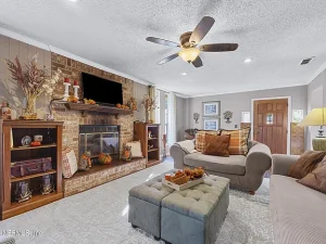 The brick fireplace adds warmth and traditional character, enhancing the home’s country appeal.