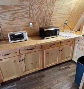 The Amish-crafted kitchen cabinetry adds craftsmanship and durability, with pullout drawers providing efficient storage solutions. The waterproof flooring enhances practicality, particularly important in a creekfront property located within a flood zone.