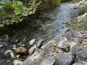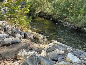 A stone firepit sits along the creek’s edge, offering the perfect gathering space for evenings under the stars. Whether roasting marshmallows, sharing stories, or simply enjoying the quiet, this outdoor feature enhances the retreat-like atmosphere.