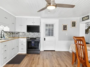 The two bedrooms provide comfortable accommodations, each offering peaceful views of the surrounding landscape. The full bathroom is conveniently located and designed for practicality and ease of use. Though modest in size, the home’s efficient floor plan maximizes every square foot, ensuring comfort without unnecessary excess.