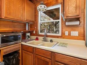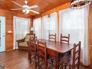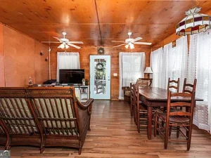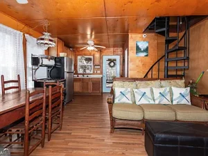 The cabin itself is full of rustic charm, designed to offer comfort, simplicity, and warmth. As you step inside, you’re welcomed into a living space that feels inviting, functional, and effortlessly cozy. Wood accents and natural textures contribute to the rustic lake-cabin atmosphere, while the open layout allows for easy flow between living, dining, and kitchen areas. Whether you’re curled up reading a book, sharing a meal, or resting after a day on the water, this cabin gives you a true sense of home.
