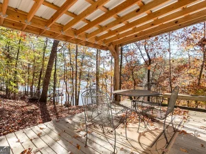 The front porch is one of the best spots on the property to take in the lake views. This outdoor space acts as an extension of the cabin’s interior—whether you’re sipping your morning coffee, enjoying an outdoor dinner, or simply soaking in the tranquil landscape, the porch becomes a favorite place to relax. The gentle slope toward the water, the tree-lined perimeter, and the peaceful ambience create an ideal setting for reflection, relaxation, and enjoying the slower pace of lake life.
