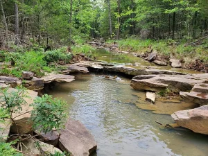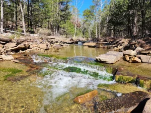 Nestled in the scenic Kiamichi Mountains, this property offers a combination of fairly level areas and gentle slopes that descend toward Little Kimbrough Creek. The creek meanders along the edge of the property, providing soothing sounds of flowing water that make this location uniquely peaceful and restorative.
