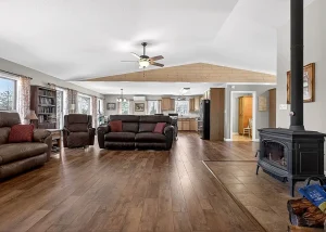 The kitchen is equipped with essential appliances, including a refrigerator, gas range, and gas water heater, offering reliable performance even in an off-grid setting. Whether preparing daily meals or hosting gatherings, the kitchen is both practical and welcoming. Adjacent dining and living spaces allow for seamless interaction, reinforcing the home’s open-concept design.