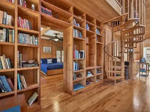 Inside, the home showcases a custom wood interior that reflects true craftsmanship and thoughtful design. Warm wood tones, combined with tile and wood flooring, create a rich yet comfortable atmosphere throughout the living spaces. Every detail feels intentional, blending rustic charm with refined finishes. Solid wood cabinetry anchors the kitchen and living areas, offering both beauty and functionality. Built-in bookshelves add character and practicality, making the home feel both elegant and lived-in.