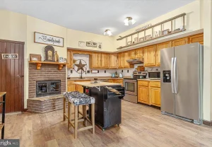 The spacious eat-in kitchen has been thoughtfully updated to combine modern functionality with classic cabin appeal. Updated appliances provide convenience and efficiency, while abundant cabinetry and counter space make meal preparation easy and enjoyable. A cozy second fireplace enhances the atmosphere, making the kitchen not only a workspace but also a gathering place. One of the standout features is the impressive walk-in pantry, offering generous storage and organization space that will be appreciated by anyone who enjoys cooking or entertaining.