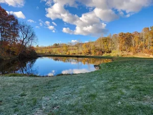 The spring-fed pond is both beautiful and functional, serving as a focal point of the landscape. With its floating dock, the pond invites quiet moments of reflection, fishing, or simply enjoying the view. Combined with the open meadows and wooded hillsides, the water feature enhances the property’s sense of balance and serenity.