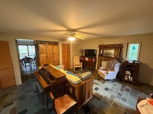 Upon entering the home, you are welcomed into a warm and inviting living space where natural textures and finishes create an atmosphere of comfort and relaxation. A combination of hardwood, tile, and laminate flooring runs throughout the home, providing both durability and visual appeal. The main living room serves as the heart of the home, offering a cozy environment ideal for gathering, unwinding, or simply enjoying the quiet surroundings.