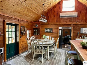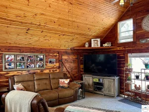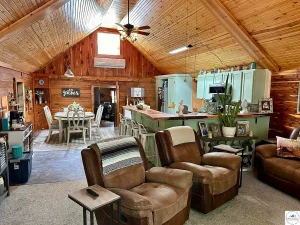 Inside, the home opens into a spacious kitchen and living room area designed for gathering, relaxing, and entertaining. The vaulted wood ceilings immediately draw the eye upward, enhancing the sense of openness while showcasing the natural beauty of the log construction. The space feels airy yet cozy, making it just as enjoyable for quiet evenings as it is for hosting friends and family.