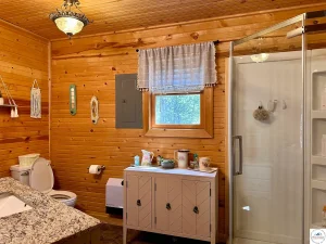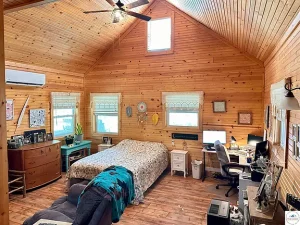An added bonus: the laundry could be relocated into the master closet, freeing up the utility room to once again function as a bedroom, guest room, or office. This adaptability makes the cabin suitable for a wide range of buyers—from couples seeking a private retreat to families needing additional sleeping space.