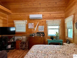 The cabin currently includes a primary bedroom and a second room that has been converted into a utility and laundry room. Importantly, this space can easily be converted back into a second bedroom if desired. The flexibility here is a major advantage, allowing buyers to tailor the layout to their needs.