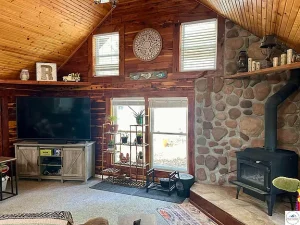 Anchoring the living area is a wood stove, providing both warmth and ambiance. On colder days, the stove becomes the natural gathering point, radiating heat and creating that unmistakable cabin feel. It’s not just a heat source—it’s part of the lifestyle this property represents.